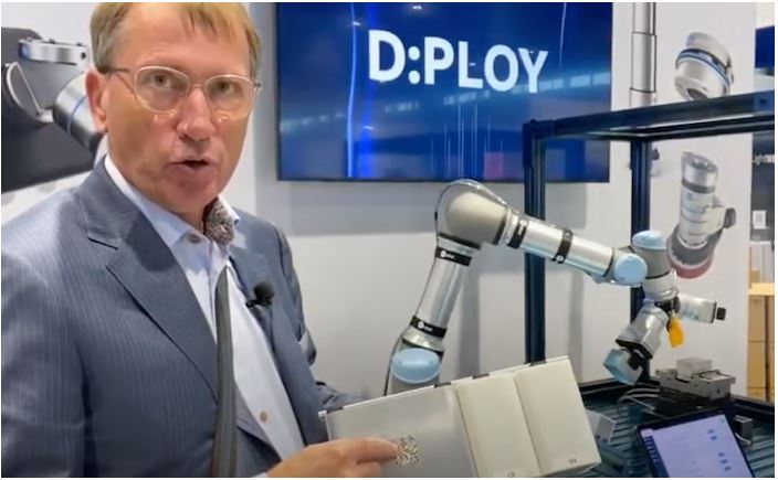 Trình diễn D:Ploy tại IMTS 2022, Enrico Krog Iversen, Giám đốc điều hành của OnRobot, giải thích rằng khi bạn kết nối rô-bốt với mô-đun D:Ploy, người dùng chỉ cần quét mã QR trên mô-đun để kết nối an toàn với hệ thống đám mây của OnRobot. sau đó có thể phát hiện tất cả các thành phần rô-bốt trong ô làm việc— rô-bốt cũng như phần cuối cánh tay của nó. Các thành phần khác trong ô làm việc được thêm vào môi trường phần mềm D:Ploy thông qua giao diện trực quan để xác định thêm không gian làm việc.