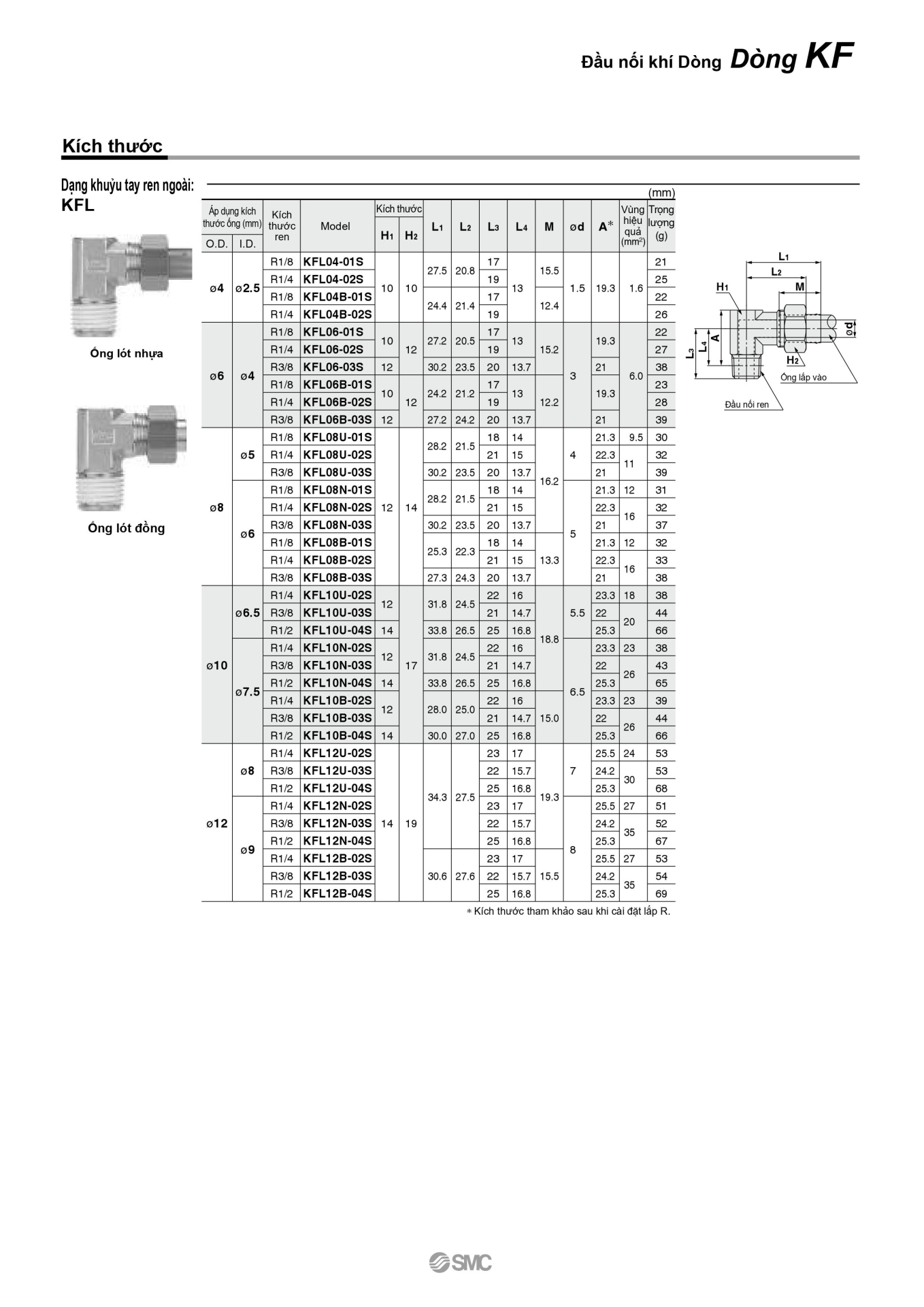 Thông tin kỹ thuật của sản phẩm SMC KFL10B-02S Dạng Khuỷu Tay Ren Ngoài